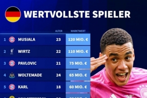 體育資訊3月29日訊 德國(guó)轉(zhuǎn)會(huì)市場(chǎng)統(tǒng)計(jì)了德國(guó)球員的身價(jià),并列出榜單,穆西亞拉1.2億歐居首,維爾茨1.1億歐次席。