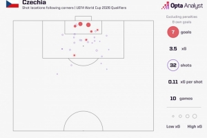 世預(yù)賽歐洲區(qū)比賽,捷克已經(jīng)通過角球打進7球,位居歐洲區(qū)所有球隊之首。