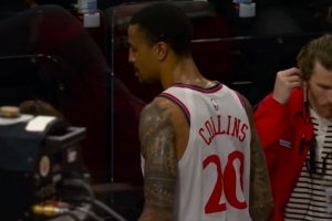 科林斯搶籃板和大洛撞到一起 膝蓋有點(diǎn)受傷回更衣室了
