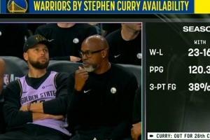 勇士主場(chǎng)迎戰(zhàn)馬刺,鏡頭給到庫(kù)里時(shí),轉(zhuǎn)播方給出了本賽季有無(wú)庫(kù)里勇士戰(zhàn)績(jī)對(duì)比。