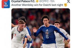 水晶宮官推也曬出鐮田大地的比賽照,并配文寫(xiě)道:“昨晚大地再一次在溫布利取得比賽勝利!”