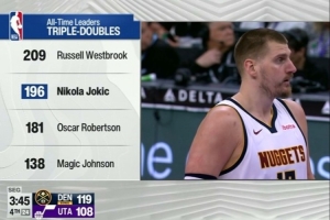 此役,約基奇輕松寫意拿下生涯第196個三雙,繼續(xù)追逐威少的209次三雙紀錄。
