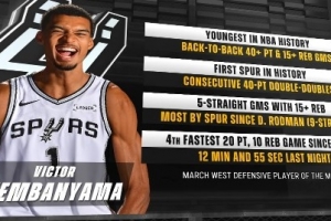 連續(xù)5場15+籃板,海軍上將(連續(xù)9場)后馬刺隊史首人