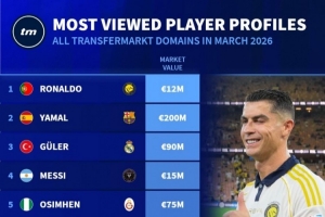 體育資訊4月3日訊 德國(guó)轉(zhuǎn)會(huì)市場(chǎng)列出了3月份球員頁(yè)面瀏覽量排名,C羅居首,亞馬爾、居萊爾、梅西前四。