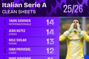 體育資訊4月3日訊 足球數(shù)據(jù)網(wǎng)站Squawka統(tǒng)計本賽季意甲門將零封榜,索默14次第一,邁尼昂第五,迪格雷戈里奧第七。