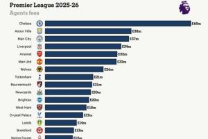 切爾西在本賽季支付了6510萬(wàn)英鎊的經(jīng)紀(jì)人費(fèi)用,連續(xù)第三個(gè)賽季領(lǐng)跑俱樂部榜單。2025-26賽季,切爾西占到了英格蘭足球聯(lián)賽92家俱樂部經(jīng)紀(jì)人總支出的12%。