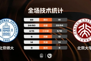 末節(jié)比賽,北京師大率先發(fā)力將分差追到個位數(shù),但這個勢頭并沒有延續(xù)太長時間,及時調(diào)整的北京大學(xué)此后打出一波小高潮穩(wěn)住局勢,他們在節(jié)末轟出一波流帶走比賽,最終北京大學(xué)大勝北京師大繼續(xù)保持不敗。