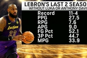 媒體oh he didn't列舉出湖人球星詹姆斯最近兩個賽季以來在東契奇或者安東尼·戴維斯缺陣時的表現(xiàn):
