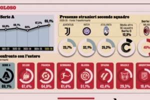 在意甲球隊二隊之中,米蘭二隊的外籍球員占比45%,國米二隊32.1%、尤文二隊23.7%。