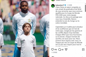 巴坎布社媒曬出自己在國家隊(duì)的照片,并寫道:“親愛的剛果兄弟姐妹們,我懷著無比的感激與自豪向大家宣布——我們的國家隊(duì)已成功晉級(jí)2026年世界杯!這個(gè)夢(mèng)想,我與你們所有人共同分享。讓我們攜手在世界舞臺(tái)上發(fā)出剛果的聲音?!?/p>