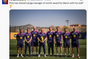 體育資訊4月11日訊 巴薩官方更新動(dòng)態(tài),弗里克與他的教練團(tuán)隊(duì)領(lǐng)取了西甲官方評(píng)出的三月最佳教練獎(jiǎng)。這位德國(guó)教練在鞏固了聯(lián)賽榜首位置后,被西甲聯(lián)賽評(píng)選為上個(gè)月的最佳教練。