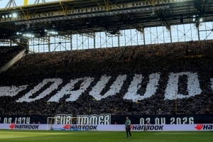 在對陣?yán)瘴謳焐谋荣愔?,多特南看臺球迷展示TIFO,致敬已故的多特俱樂部工作人員達(dá)烏德·穆罕默德。