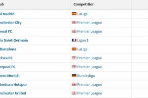 附歐洲身價(jià)前十俱樂部(單位:歐元):