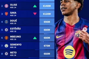 體育資訊4月13日訊 德轉(zhuǎn)更新了足壇右邊鋒身價(jià)情況,亞馬爾以2億歐居首,奧利塞以1.4億歐位居次席。