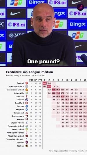 體育資訊04月13日訊 英超第32輪,曼城3-0大勝切爾西,opta更新了英超奪冠概率,依舊看好阿森納,奪冠概率為87%。