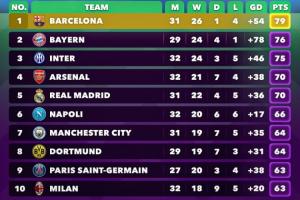 體育資訊04月13日訊 歐洲五大聯(lián)賽已經(jīng)進(jìn)入最后沖刺階段,Score90統(tǒng)計(jì)了五大聯(lián)賽合并的積分榜,表格從左至右分別為比賽場(chǎng)數(shù)、勝、平、負(fù)、凈勝球以及積分。巴薩以79分位居第一,拜仁第二,國米第三,阿森納第四。