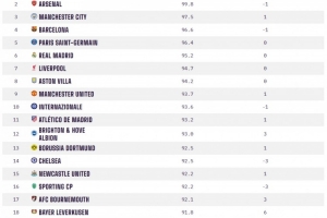 體育資訊4月13日訊 著名數(shù)據(jù)機(jī)構(gòu)OPTA對全球超過10000家俱樂部打造了一個(gè)評分系統(tǒng),評分范圍從0到100。其中,0分代表全球最弱的球隊(duì),而100分則代表全球最強(qiáng)的球隊(duì)。在OPTA全球俱樂部實(shí)力榜中,拜仁、阿森納、曼城、巴薩以及巴黎圣日耳曼位居前五。