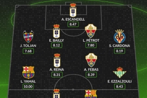 體育資訊4月14日訊 西甲第31輪戰(zhàn)罷,數(shù)據(jù)網(wǎng)站W(wǎng)hoscored也評(píng)選出本輪比賽評(píng)分最高陣容,其中亞馬爾滿分10分領(lǐng)銜,具體如下:
