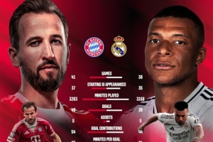 全文摘要:拜仁歐冠戰(zhàn)皇馬,官方曬凱恩與姆巴佩本賽季數(shù)據(jù)對比。凱恩在進(jìn)球、參與進(jìn)球、射門轉(zhuǎn)化率等關(guān)鍵數(shù)據(jù)上全面占優(yōu),效率更高,展現(xiàn)了強(qiáng)大的得分能力。