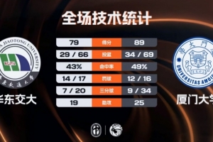 末節(jié)比賽,華東交大雖然有追分的勢(shì)頭,但廈門大學(xué)總能及時(shí)給出回應(yīng),即使在比賽結(jié)束前華東交大將分差追回到個(gè)位數(shù),也因比賽時(shí)間所剩不多未能獲得逆轉(zhuǎn)機(jī)會(huì),最終廈門大學(xué)戰(zhàn)勝華東交大成功晉級(jí)。