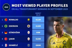 全文摘要:德國轉(zhuǎn)會市場公布9月球員頁面瀏覽量排名。C羅以超高熱度位居榜首,埃德森、京多安分列二、三位。盡管梅西排名第七,但C羅的統(tǒng)治地位依舊穩(wěn)固,彰顯其全球巨大影響力。