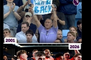 英超官方社媒曬出考文垂2001年、2026年的對比照片,對考文垂表示祝賀。2001年的照片中,考文垂球迷舉起的標(biāo)語寫著:“我們會回來的!”