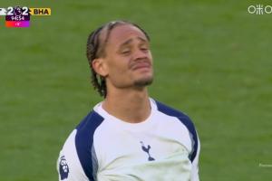 體育資訊04月19日訊 熱刺vs布萊頓,魯特爾破門,布萊頓第94分鐘絕平熱刺!鏡頭隨即給到西蒙斯,這場世界波+助攻的他非常痛苦!