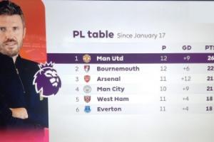 體育資訊04月19日訊 本輪英超,切爾西0-1不敵曼聯(lián)。如果比較卡里克上任后的英超積分榜,卡里克率領(lǐng)的曼聯(lián)高居英超第一。