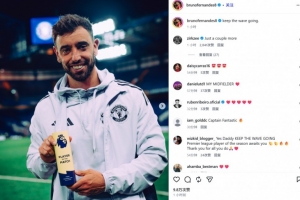 B費也在賽后通過社媒曬出自己手捧英超官方全場MVP獎杯的照片,并配文:“繼續(xù)保持當前的勢頭!”