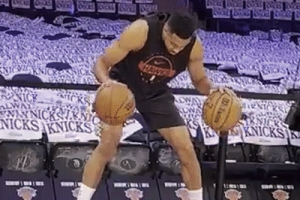 體育資訊4月23日訊 近日,老鷹球員CJ·麥科勒姆賽前在場(chǎng)邊練習(xí)控運(yùn)。