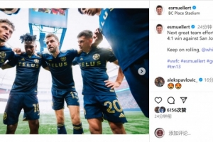 穆勒社媒曬出與隊(duì)友的合照,配文:“又一場(chǎng)出色的團(tuán)隊(duì)表現(xiàn),4-1擊敗圣何塞。繼續(xù)前進(jìn),溫哥華白浪!”