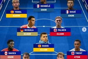 前鋒:亞馬爾(西班牙,2億歐元)、登貝萊(法國(guó),9000萬(wàn)歐元)、杜埃(法國(guó),9000萬(wàn)歐元)