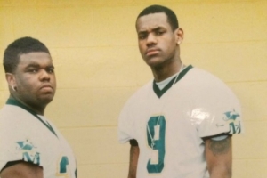 詹姆斯轉(zhuǎn)發(fā)了媒體rare_sports發(fā)布的他和高中隊(duì)友Sian Cotton身穿圣文森特圣瑪麗高中橄欖球隊(duì)球衣的合照。