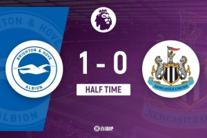 傷停補(bǔ)時(shí)5分鐘。上半場(chǎng)比賽結(jié)束,布萊頓1-0紐卡斯?fàn)枴?/p>