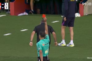 比賽補時階段,弗里克不滿裁判,兩黃變一紅被罰下,他將無緣下輪的國家德比。