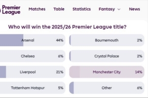 英超官網(wǎng)表示,這可能是英超有史以來最精彩的冠軍爭(zhēng)奪戰(zhàn)之一。他們發(fā)起了“誰能最終奪冠?”的球迷投票,槍手最被看好,他們的得票率高達(dá)44%。紅軍曼城緊隨其后。