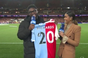 理查茲接到禮物時激動地喊道:“你們給我準(zhǔn)備了禮物,這是什么禮物???”原來這是一件曼城和阿森納縫合的球衣。