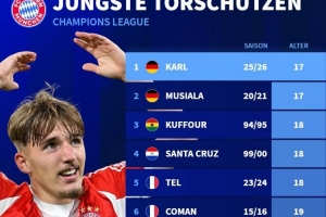 拜仁隊史歐冠最年輕進(jìn)球者排名: