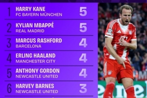 體育資訊10月23日訊 本賽季歐冠聯(lián)賽階段已戰(zhàn)罷3輪,Squawka統(tǒng)計了到目前為止歐冠進球數(shù),拜仁前鋒凱恩和皇馬攻擊手姆巴佩都打進5球,分列前二位。