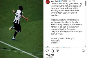 伊薩克寫道:“我要向我的隊(duì)友們、工作人員們,向大家,尤其是紐卡斯?fàn)栠@座城市以及所有出色的球迷們,表達(dá)我的感激之情,感謝我們一起度過的這難以忘懷的三年。