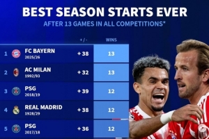 德轉(zhuǎn)列五大聯(lián)賽球隊(duì)賽季各項(xiàng)賽事前13場(chǎng)最佳開局:
