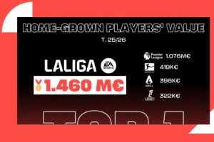 另一方面,這并未對人才保留產(chǎn)生負面影響。除了西甲本土球員的經(jīng)濟價值外,它還是給予青訓(xùn)營球員最多機會的聯(lián)賽,在2024/25賽季,本土球員出場時間占比為19.8%,而法甲為13.5%、德甲為7%、英超為6.4%、意甲為5.5%。這些數(shù)據(jù)鞏固了西班牙足球作為最佳整合本土人才的環(huán)境的地位,結(jié)合了競技表現(xiàn)和經(jīng)濟可持續(xù)性。