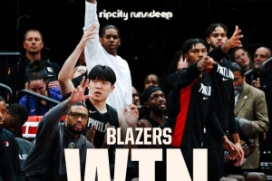 賽后,開拓者官方分享本場比賽贏球海報,鏡頭給到慶祝時的替補席,楊瀚森和利拉德入鏡。