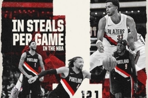 體育資訊11月5日訊 開拓者官方發(fā)布數(shù)據(jù)海報,球隊場均送出12.1次搶斷,排名聯(lián)盟第一。