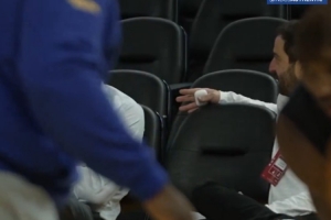 有人拍到鄧?yán)S的經(jīng)紀(jì)人與勇士總經(jīng)理鄧?yán)S在場(chǎng)邊聊天,而庫(kù)明加在鏡頭近景訓(xùn)練。