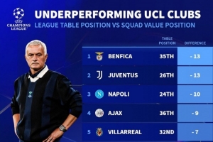 本賽季歐冠表現(xiàn)不佳球隊(duì)榜(括號(hào)內(nèi)為目前排名):