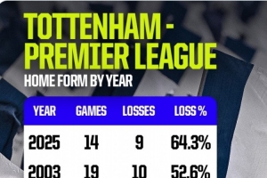 熱刺此前只在1994年、2003年主場(chǎng)輸球場(chǎng)次達(dá)到10場(chǎng),而今年他們還有4場(chǎng)英超主場(chǎng)比賽。