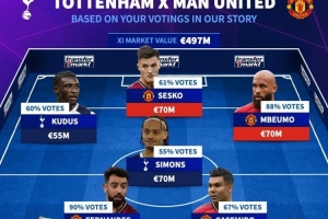 體育資訊11月8日訊 北京時間今天晚上20點30分,熱刺將在英超第11輪比賽中主場對陣曼聯(lián)。德國轉(zhuǎn)會市場根據(jù)關注者的投票列出熱刺+曼聯(lián)陣容,B費、舍什科、西蒙斯、范德芬在列。