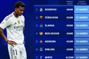 全文摘要:德轉(zhuǎn)盤點(diǎn)了身價(jià)2500萬歐以上的遭遇進(jìn)球荒的攻擊手。羅德里戈(皇馬)與弗格森(羅馬)均以連續(xù)27場進(jìn)球荒居首,伊蘭加(25場)緊隨其后。榜單中還包括維爾茨(利物浦,17場)、馬杜埃凱(阿森納,16場)等知名球員,身價(jià)從2500萬歐至1.3億歐不等。