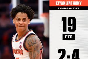 此役,卡梅隆·安東尼之子、雪城大學后衛(wèi)基揚·安東尼迎來大學生涯第一次首發(fā),他表現(xiàn)十分高效,全場上陣29分鐘11投8中,三分4中2、罰球4中1,砍下19分3籃板4助攻1搶斷,沒有失誤。